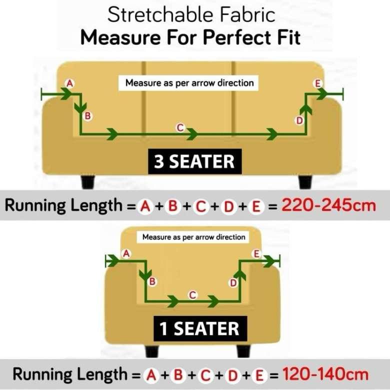 Made from polyester with 5% spandex for elasticity, the sofa cover fits standard 3 seat sofas with arms, having arm to arm running length range of 220-245cm (Please refer sizing image for clarity).